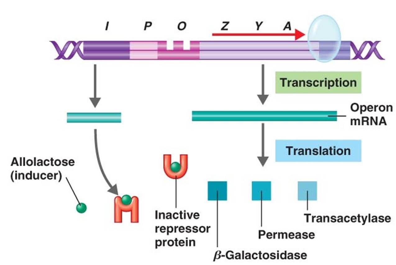 Bu lac operonunda Z,Y,A yapısal genleri ve bunlarında hemen yanında operatör bölge denilen DNA dizileri yer alır. Araştırmacılara göre lacI geni bir baskılayıcı molekül oluşturarak yapısal genlerin transkripsiyonunu regüle ediyor ve bu baskılayıcı allosterik moleküldür. Yani molekül başka bir moleküle tersinir olarak bağlanır ve hem 3 boyutlu yapısı değişikliğe uğrar hemde kimyasal aktivitesi değişir.
